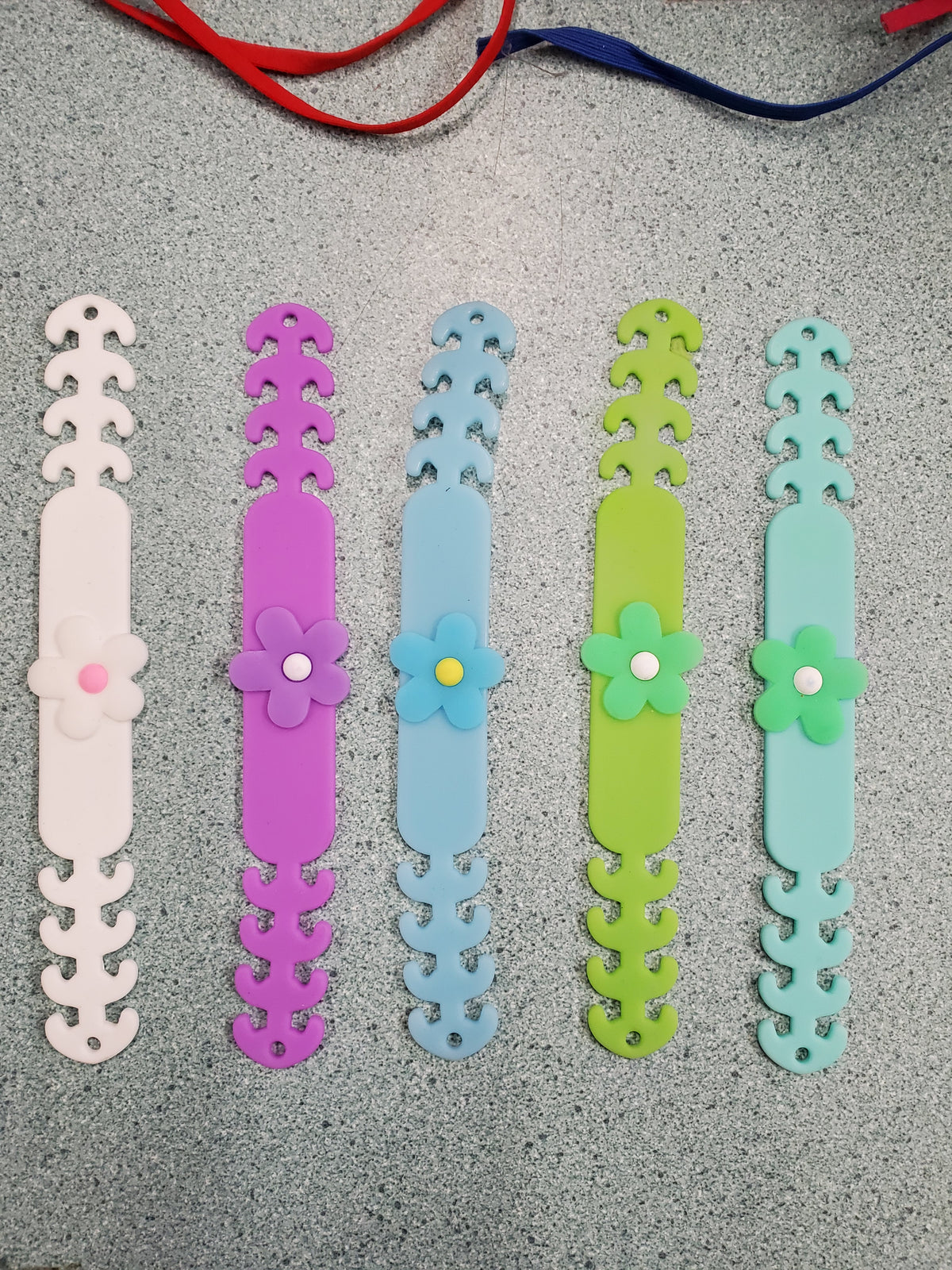 Use this PVC silicone band to attach to the elastics on your mask to ease the strain on your ears. Elastics attach to the band and will take the stress away from your ears while wearing the mask for long periods. Comes in a variety of colours with or without flower decoration. $2.00 for Plain, $2.50 with Flower Decoration
