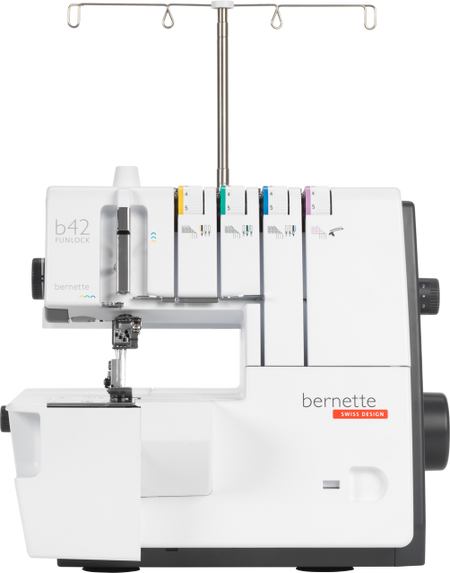 This is made easier by the colour-coded threading paths and the lower looper threader. Just follow the coloured symbols and you will soon have your bernette Funlock 42 threaded.