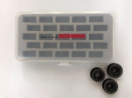 Genuine Bernina Bobbins. Available in single, 5 pack or 25 pack with reusable Genuine Bobbin Box as shown. (Bobbin box comes with 25 bobbins with the word Bernina in Red written on cover)