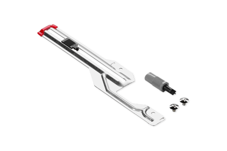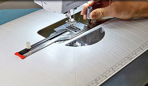 The attachment is screwed to the freearm. The center of rotation can be either to the right or left of the needle, with the attaching screw lying flat enough to allow the fabric to feed smoothly over it. A diameter of between 1 inch and 5-5/16 inches (2.5 cm and 13.5 cm) can be set on the slide.