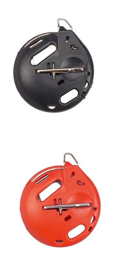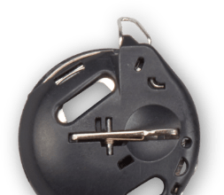 Great for underthread sewing or bobbinwork, this red bobbin case is found in the accessories catalog and marked by a small triangle.