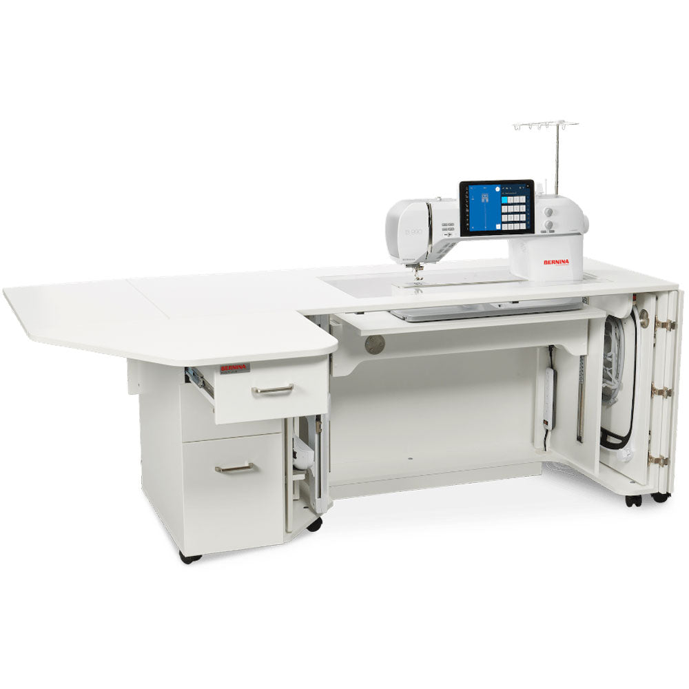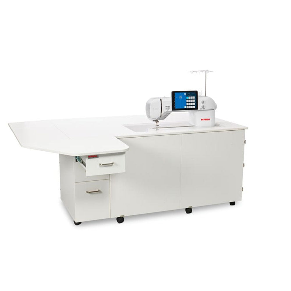 The 34" electric lift accommodates the largest machines on the market and allows the ultimate center of needle sewing position. The bottom cut-out allows more leg room to the left side of the sewing machine for the most comfortable sewing experience, and the added kick plate keeps the foot control from sliding underneath the cabinet.