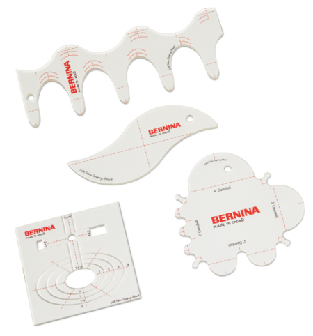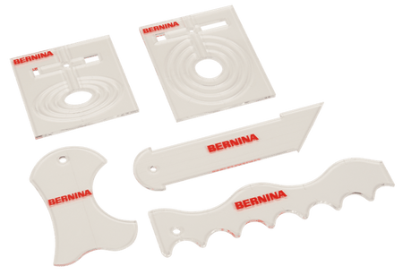 The Curves and Clams Ruler Kit is suitable for all BERNINA sewing machines and for the BERNINA Q Series Longarm machines. In combination with the Adjustable Ruler Foot #72/72S or Ruler foot #96 , kit can be used to create decorative quilting patterns such as squiggly lines, curves, mini ovals or clamshells. These ¼" thick rulers have fabric-gripping technology to help keep them in place while you stitch. Marked guidelines make it easy to align your ruler for repeating motifs.
