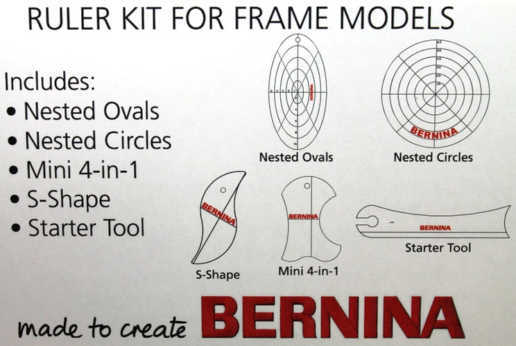 The Ruler Kit is suitable for all BERNINA sewing machines and for the BERNINA Q 20 sit-down longarm machine. In combination with the Adjustable Ruler Foot #72 or Ruler Foot #96, the Ruler Kit can be used to create decorative quilting patterns. The height of the rulers is desiged so that they are easy to guide and can be comfortably moved under the presser foot with the quilting project.The kit contains five rulers: