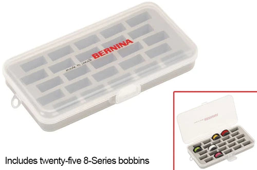 Genuine Bernina Bobbins. Available in single, 6 pack or 25 pack with reusable Genuine Bobbin Box as shown. (Bobbin box comes with 25 bobbins with the word Bernina in Red written on cover)