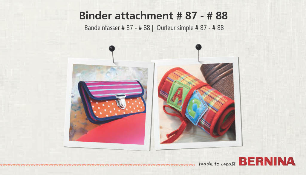 Available in three versions for tape widths of 28 mm (scant 1-1/8”), 32 mm (1-1/4”) and 38 mm (scant 1-1/2”), Binder Attachment for Unfolded Bias Tape #88 must be used with matching Binder Foot #95 / 95C for perfect results.