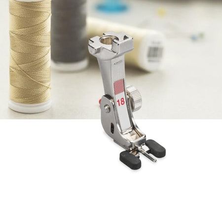 In addition, Button Sew-On Foot #18 has an adjustable middle toe, allowing you to vary the height of the thread shank according to fabric thickness. The middle toe can be flipped up and away when not in use.