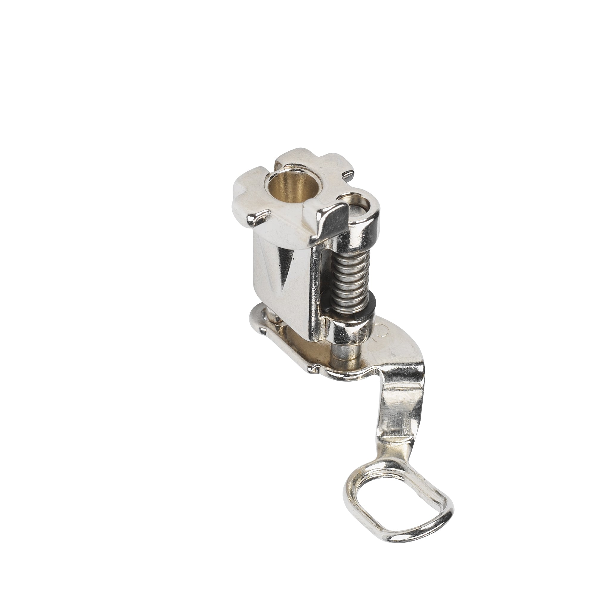 The vertical spring on the presser foot presses the sole to the fabric, preventing the material from pulling up with the needle (flagging). The result is a neat, consistent stitch pattern. What’s more, this oval foot with its slight upward tilt facilitates the stitching movement, even over bulky materials.