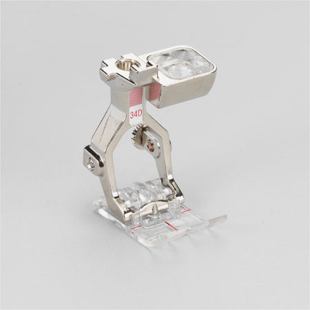 Reverse Pattern Foot with Clear Sole #34D affords a clear view of the needle and stitching area. The red markings on the top of the presser foot allow for especially precise and careful sewing.