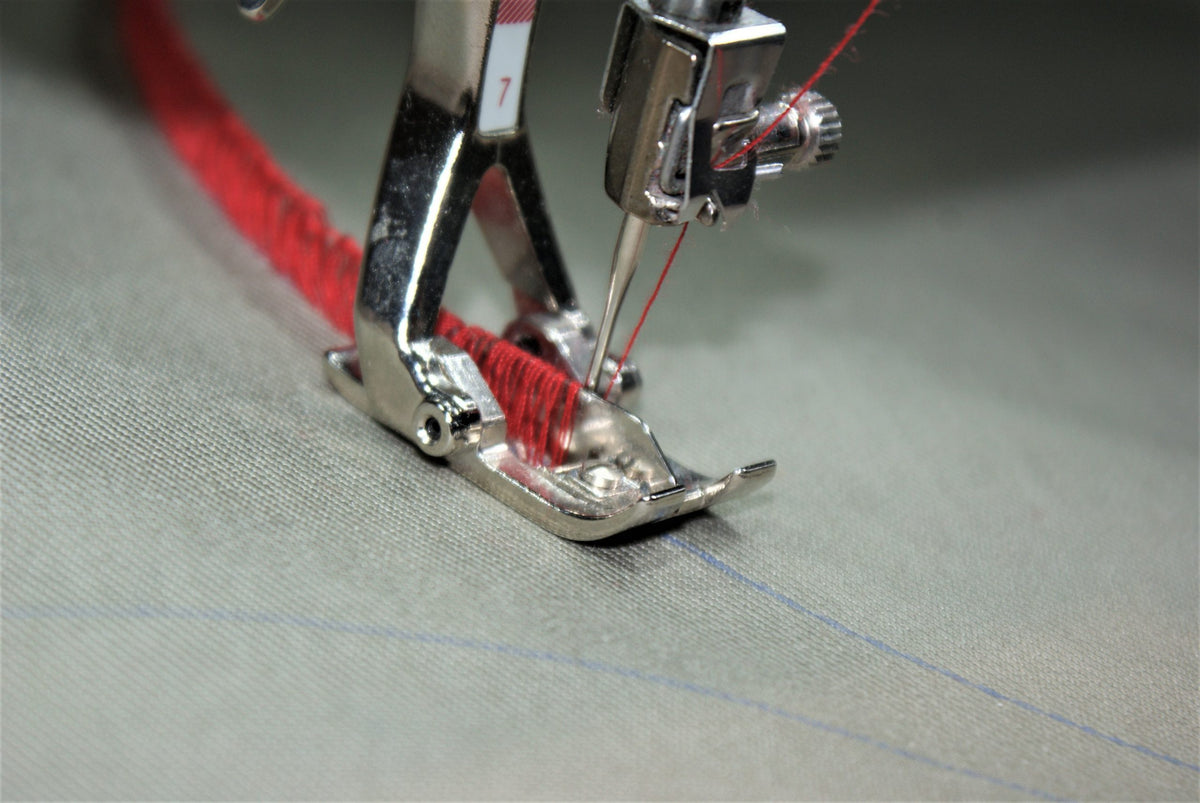 When sewing together two pieces of fabric with Tailor Tack Foot #7 the thread tension is loosened slightly, so that the thread can pass easily over the ridge in the center of the foot. The zigzag stitch used forms loose loops which then slide off to the back thanks to the special V-shaped opening on the foot.