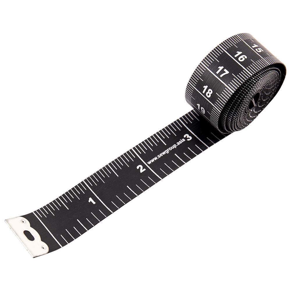 Modern black double-sided tape measure with silver markings. The tape measure is made from durable non-stretch fibreglass, featuring metric and imperial measurements. Extra wide size makes reading measurements easier.