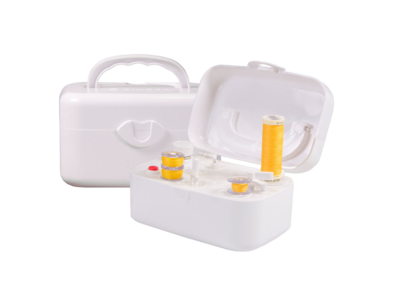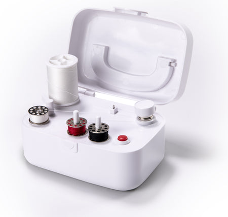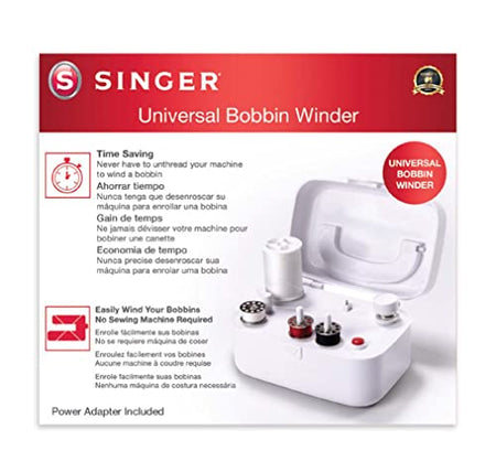 Save time and stay organized with the SINGER Portable Bobbin Winder. The one-touch auto winding is paired with an auto shut off that stops when the bobbin is full. Portable and powered by cord, or battery, ensures that you have thread with you, wherever you may go!