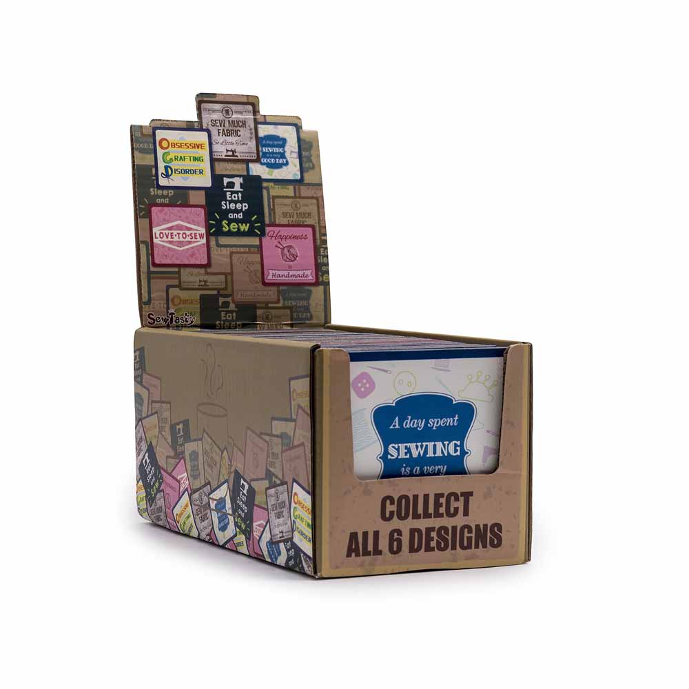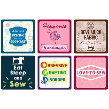 6 assorted fun and catchy sewing designs with each coaster being 9.2 x 9.2cm (35⁄8″ x 35⁄8″) and made of 6mm MDF fibreboard.