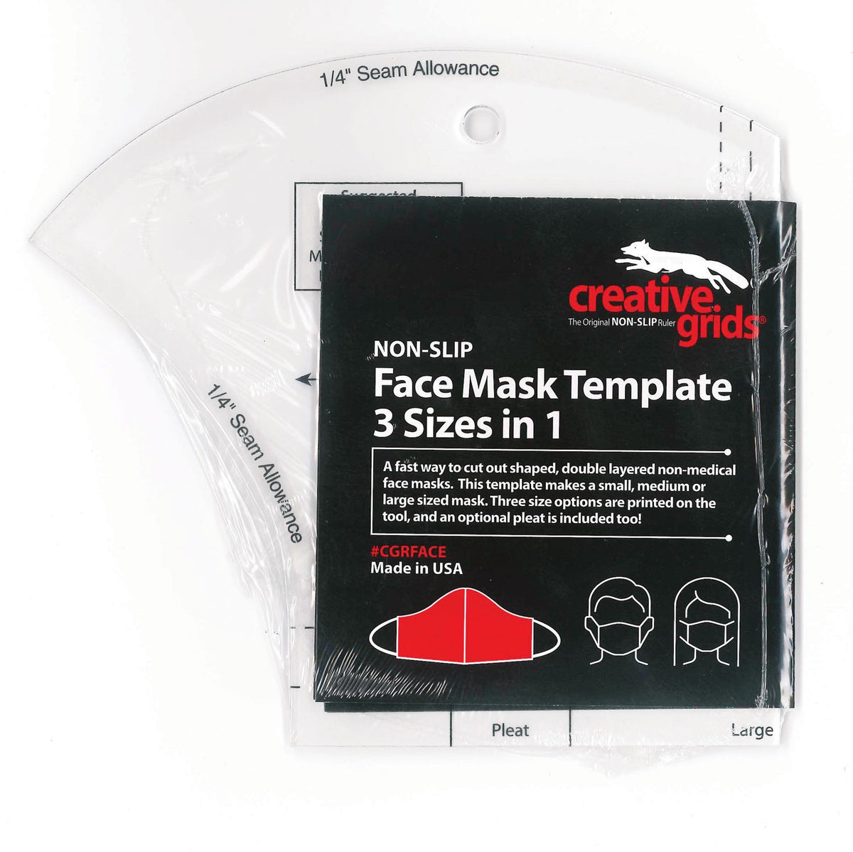 The Face Mask Template is a 3-in-1 template that makes a small, medium, or large sized mask. An instruction guide is included with the template. The Face Mask Template is a fast way to cut out shaped double layered face masks. Simply stack 2 coordinating fabric pieces; two times; (with right sides together) and cut around the template with a rotary cutter. We find that a 28mm cutter works best around the curves.
