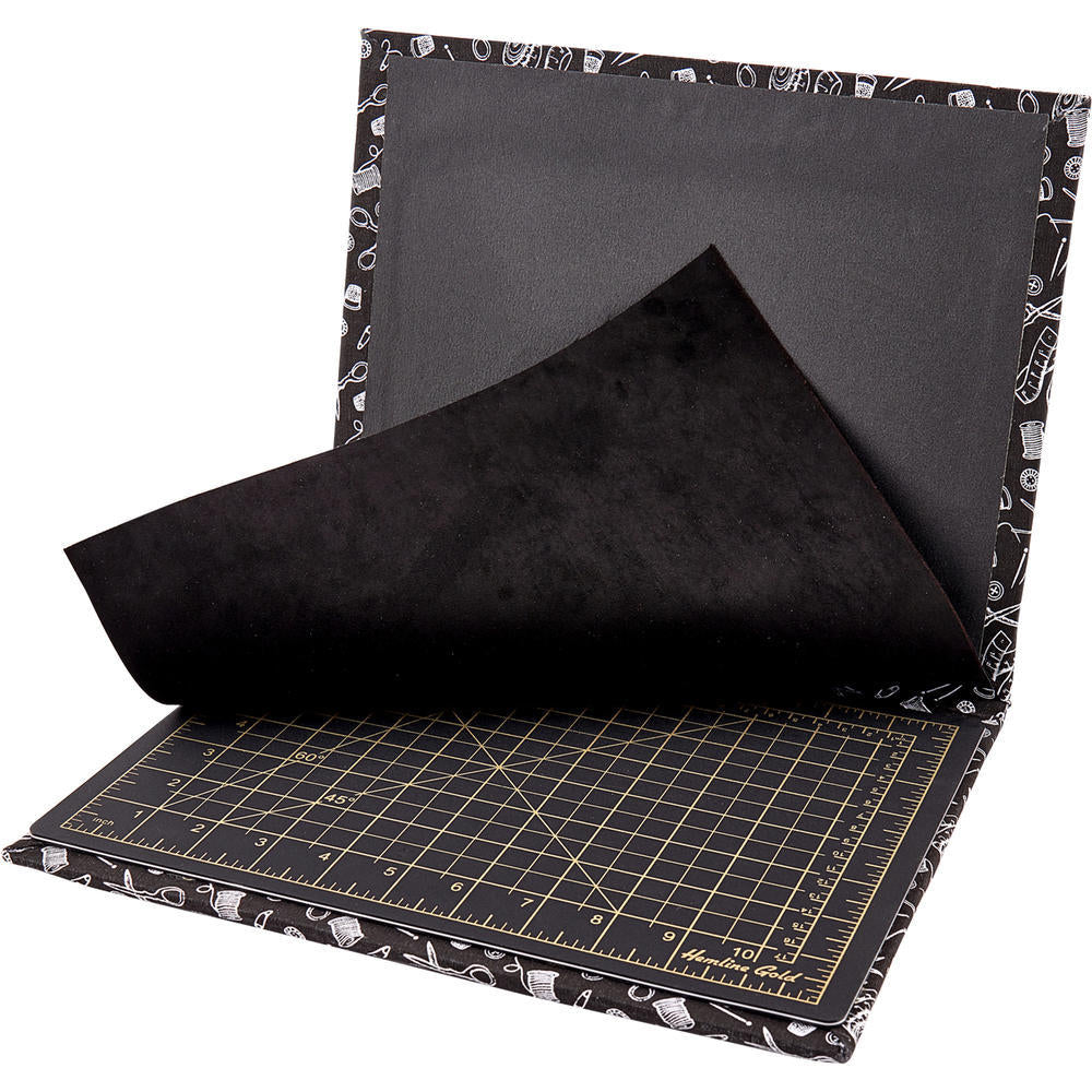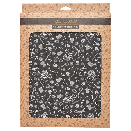 The 4-in-1 Multi Mat contains a self-healing cutting mat with metric and imperial guidelines in an easy-to-read gold print. It features an anti-slip layout sheet for placing blocks or pattern pieces. Fine sandpaper pattern markers surface to keep the fabric in place while marking lines. It's also able to open up to 30cm x 42cm to create a padded ironing mat. The Multi Mat is covered in 100% cotton Hemline Gold signature print. When not in use, the mat can be stored flat to prevent creases in your fabric and pattern pieces.
