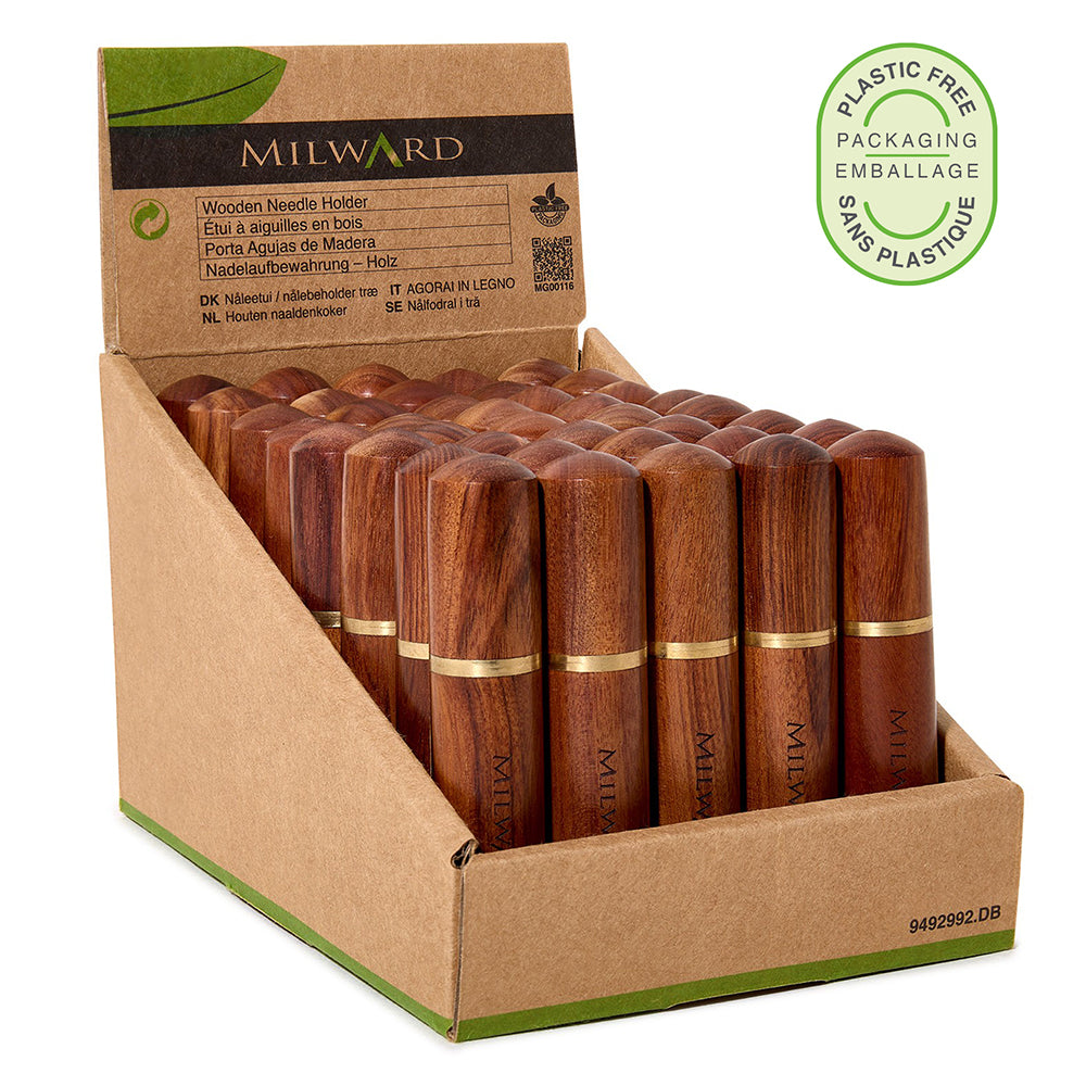 High quality dark rosewood needles and pins holder. Accommodates needles and pins up to 7cm / 23⁄4″. Secure screw cap ensures the safety of needles and pins. Finely polished natural wood with a premium finish. Material: rosewood, copper. Product dimensions: Diameter 1.7 x L8.5cm (5⁄8″ x 33⁄8″).