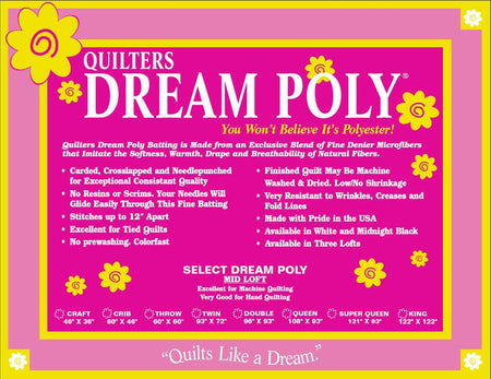 - Dream Poly resists bunching and shifting and is strong enough to stitch up to 12″ apart giving the quilter incredible freedom of design.