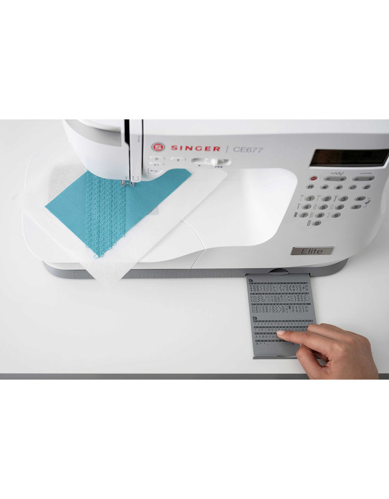 The extra-sturdy yet stylish SINGER® | Elite CE677 - Computerized Sewing Machine features 411 stitch applications through 200 built-in stitches. To further personalize your projects, it includes lettering and character options as well as seven automatic one-step buttonhole styles, perfectly sized for your button.