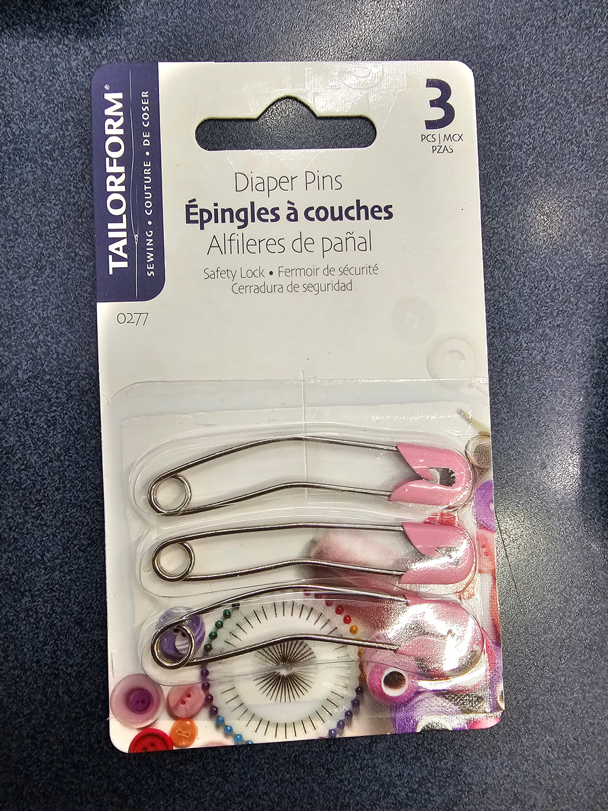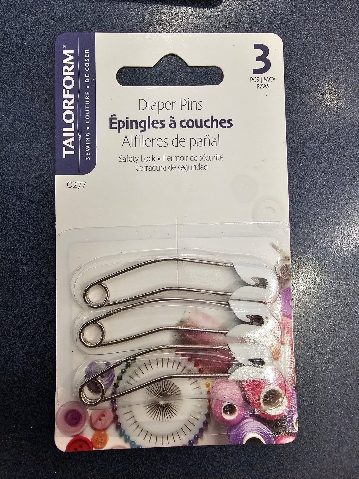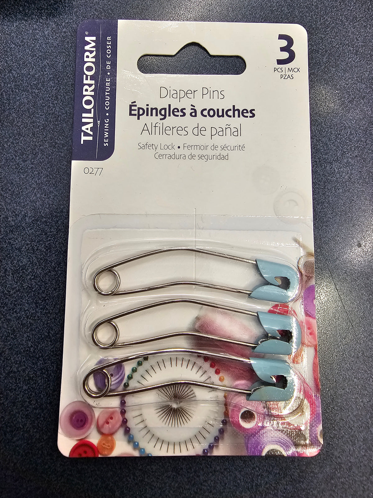 These diaper pins from Tailorform are equipped with safety locks for reliability. Three pins are included per package.
