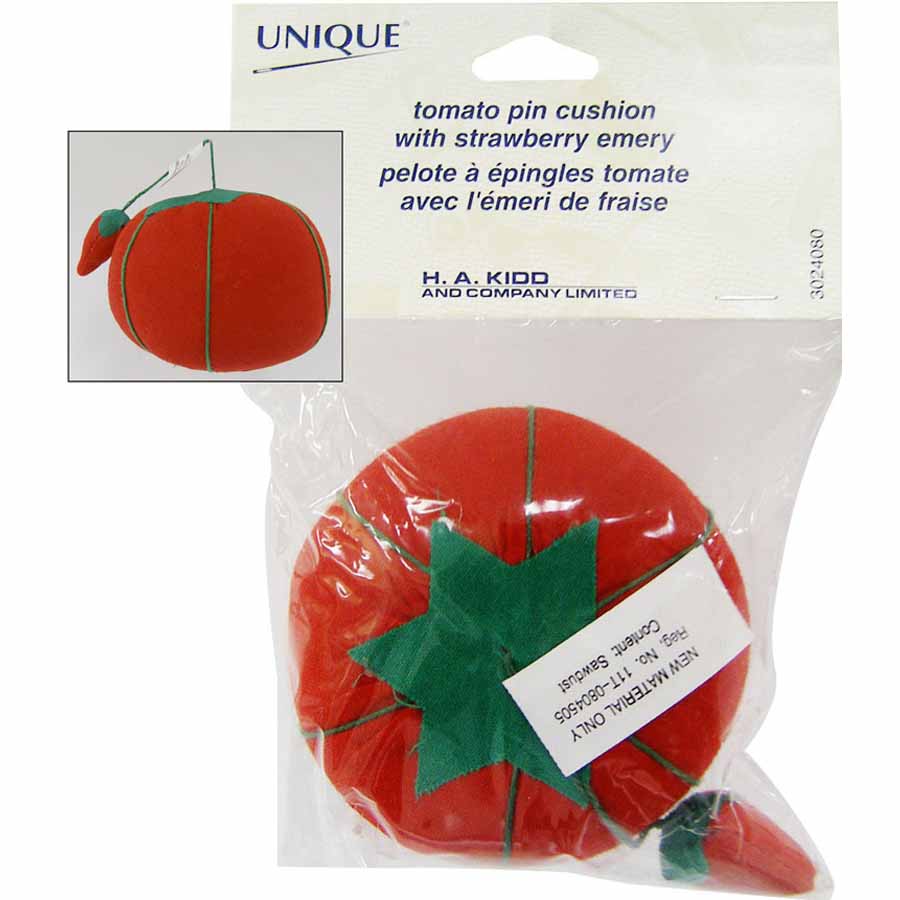 Securely holds pins and needles in place. Strawberry emery attached for sharpening and cleaning.