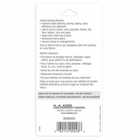 Instant basting adhesive. Replaces baste stiching, pinning, taping, spray adhesives, and stabilizers. Safe to use on cotton, wool, polyester, blends, felt, linen, leather, vinyl, and paper. Keeps shirt collar tips in place. Temporarily hems pants. Secures straps to undergarments. Test on fabrics before use, disappears after first washing on most fabrics.