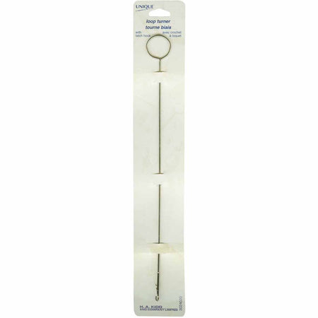 Turns bias tubing, button loop, or cord right side out with a latch hook at the end.